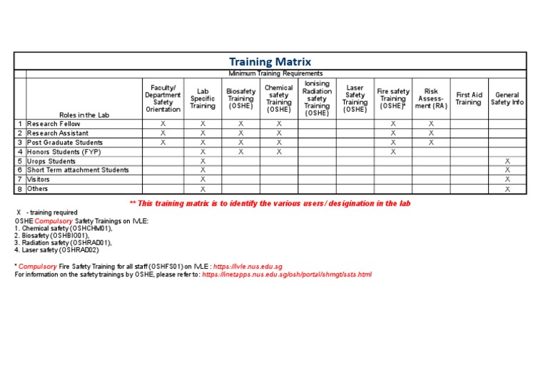 The matrix can be used to prove that the employee is up to date on certifications and has completed all training. This training matrix is designed to help you identify the mandatory training requirements for your job role. Using a training matrix when managing learning courses for staff with a training matrix, an organisation's unique roles, training topics, courses that satisfy the training topics, and the set training requirements can be uploaded and assigned to a large number of staff. By using the skills matrix, they can identify training opportunities. Employee safety training programs take place in all companies.